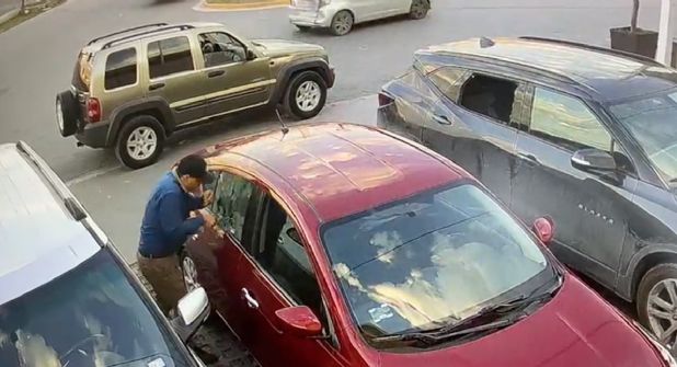 En el video que ya circula en las redes sociales, se ve el momento en que este hombre se dirige a una camioneta negra y con lo que parece ser una bujía, rompe el cristal, para luego meter la mitad de su cuerpo y sacar una computadora portátil.