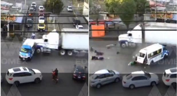 En un acto de imprudencia al volante, cámaras de seguridad captaron el momento justo en que, al pasarse el alto, un tráiler embistió un transporte público del Estado de México, con tal intensidad que los pasajeros salen volando por las ventanas de la unidad.