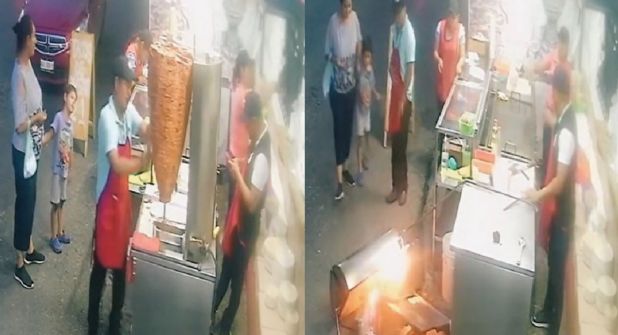 En un video que pronto se hizo viral en redes sociales, se ve el momento en que un hombre empieza a cortar de un gran trompo de carne, y deja caer la carnita sobre un plato, repentinamente y sin alguna explicación aparente, el trompo cae completo al suelo.