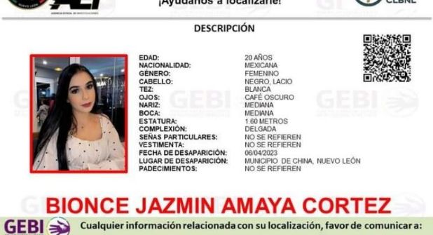 Una joven de 20 años, residente de Mission, Texas, estuvo de visita en China, Nuevo León, y está desaparecida desde el domingo pasado.