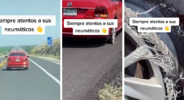 Enojo y sorpresa reflejaron varias personas que iban en una camioneta grabando a un auto que iba adelante de ellos sin una de las llantas traseras, prácticamente estaba rodando con tres llantas y un rin.