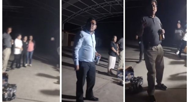 En el lugar estaban reunidos lo que parece ser el grupo de docentes de esta escuela acompañados por el director de la misma, asimismo, en el suelo se observa inconfundible bolsas con cervezas.
