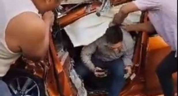La bolsa de aire cubre totalmente al pasajero y en cuanto el segundo hombre logra quitar un revestimiento de la puerta, el pasajero no identificado, logra salir de manera instantánea, con su celular en mano y sin aparentes rasguños, ni lesiones en el cuerpo.