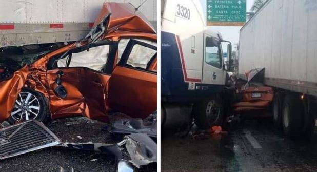 Las fotografías son impactantes, pero el video es fuera de serie; ver cómo un auto Nissan tipo Versa quedó hecho pedazos debajo de un tráiler y momentos después un hombre es rescatado sin un sólo rasguño, es un milagro.