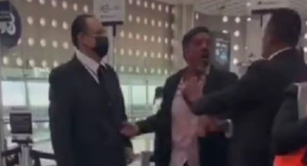 El hombre se resistía a irse del aeropuerto y continuó gritándole al personal, incluso los acusó de quererlo "fusilar".