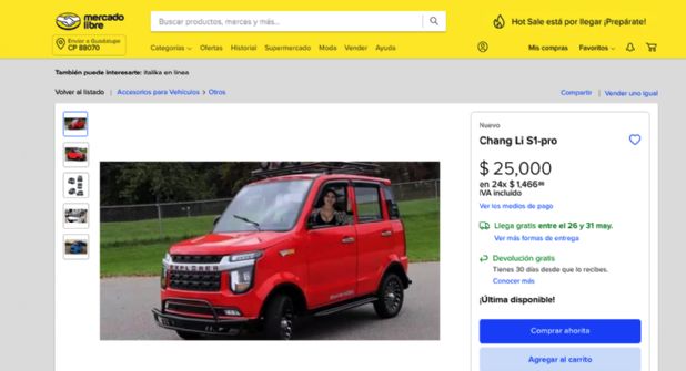 En el sitio oficial del portal aparece uno de los populares autos eléctricos de origen asiático que están ganando adeptos alrededor del mundo por sus precios bajos.