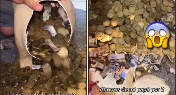 Luego de golpearlo con una pequeña hacha de mano, el cerdito desparrama todo su contenido, revelando monedas de distinta denominación e incluso billetes de hasta 500 pesos. Sin duda sería un gran monto, pues de acuerdo con la usuaria, su padre había intentado meter cerca de mil pesos diarios en la alcancía.
