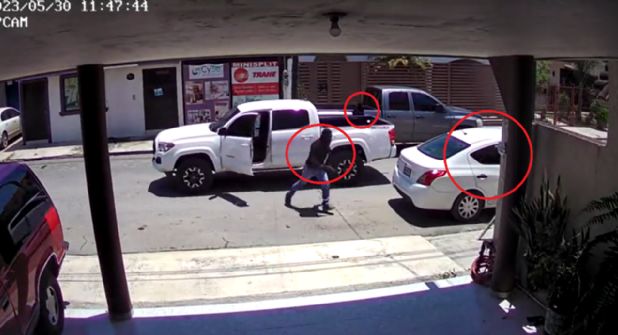 En un video captado en una cámara de seguridad del estacionamiento de las oficinas del despacho se ve cómo una camioneta se detiene a mitad la una calle, en sentido contrario al Nissan Versa en el que iban las mujeres, y descienden dos hombres encapuchados.