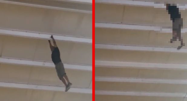 En un video compartido en redes sociales, se puede observar al sujeto columpiándose en la viga de metal; en un momento no aguanta más su peso y cae desde una altura de 6 metros, justamente donde se pusieron los materiales que le salvaron de una herida grave.