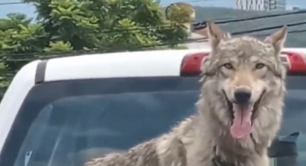 Una usuaria en Twitter compartió un video en el que un lobo aparece muy "quitado de la pena" en la caja de una camioneta pickup que circulaba sobre una avenida de la capital de Nuevo León.