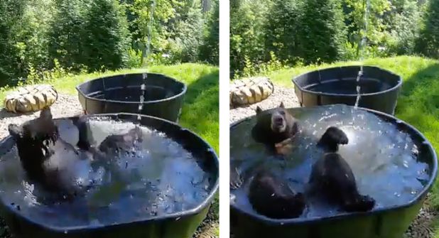 El oso negro fue grabado en su momento de éxtasis dándose un refrescante baño, tratando de mojarse el cuerpo entero dando volteretas y tomando posturas de satisfacción plena.
