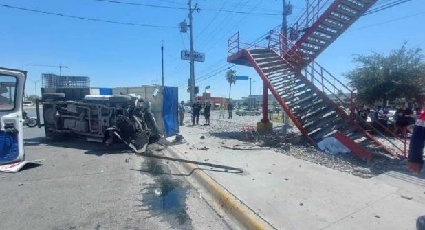 El accidente ocurrió en la avenida Miguel Alemán, de San Nicolás hacia Apodaca; el conductor del vehículo perdió el control y volcó frente al Parque Industrial Kalos; avanzó algunos metros, se impactó contra la banqueta y después contra un puente peatonal, en donde se encontraban varias personas.