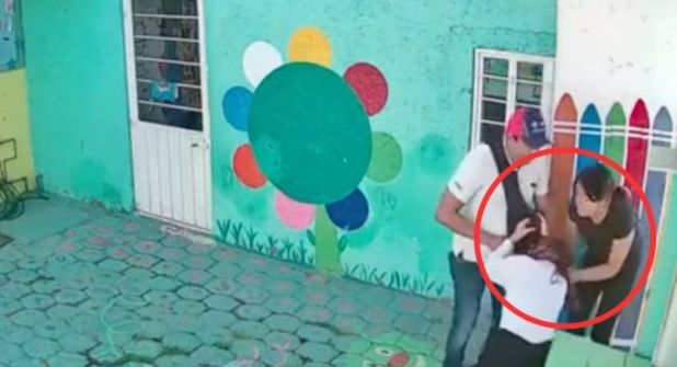 Las imágenes muestran el momento en el que la educadora sale al patio escolar para atender el llamado a la puerta. Posteriormente una mujer, en compañía de su esposo, comienza a jalarla del cabello, mientras ingresan hasta el fondo del kínder.