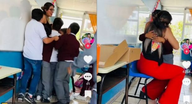 Al decir esto, rompió en llanto y sus alumnos corrieron hasta ella para abrazarla y le piden que no se vaya.
