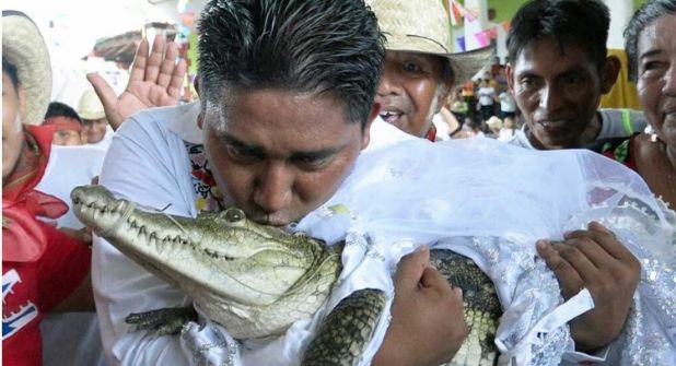 Fieles a la tradición de pedir prosperidad y abundancia para su comunidad, un alcalde de Oaxaca se casó con un caimán hembra.