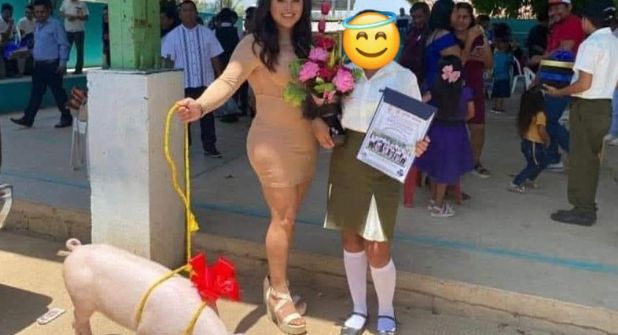 Aparte de la fémina y la estudiante, la instantánea trae otro detalle peculiar, de igual manera criticado, un pequeño cerdo color rosa con un lazo rodeándolo para evitar que escape, además de un moño rojo; el animal es un regalo para la jovencita, próxima a ingresar a secundaria.