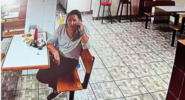 El video muestra el momento en que la mujer termina de comer, realiza una llamada y de pronto se dirige a la salida del negocio, sin detenerse en ningún momento.