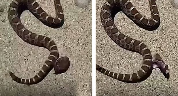 Una cabeza de serpiente de cascabel desprendida de su cuerpo se muerde a sí misma en un video que recorre las redes sociales. En las imágenes se puede observar que al rozarse se muerde y entierra sus propios colmillos con violencia.