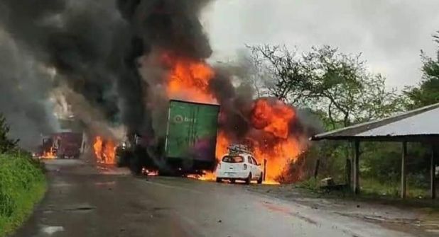 La mañana de este martes se reportaron 13 tráileres incendiados, así como una patrulla, en la carretera Tepetzintla-Tantoyucan, en Veracruz, lo que bloqueó la vialidad.