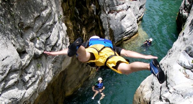 El recorrido incluye subidas y bajadas por caminos de tierra y roca, así como recorrer el río tanto a cielo abierto como en subterráneo, lanzarte por toboganes de piedra y hacer rapel de hasta 27 metros de altura o incluso lanzarte alío desde una roca de hasta 12 metros de altura.