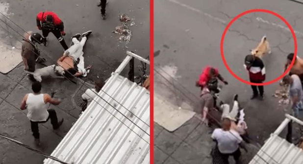 La grabación muestra como por breves momento un perro de la calle se une a la pelea, propinándole una buena mordida a la altura del cuello.