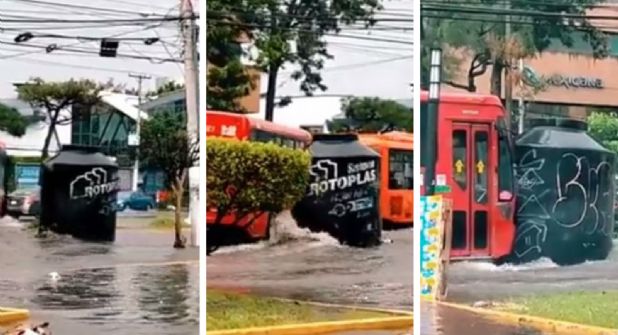 Lo anterior se registró este fin de semana sobre la arteria Mariano Otero, frente al complejo comercial Plaza del Sol, después de que el agua arrastró al recipiente de plásticos, que se hallaba en una obra negra en las cercanías, pero como estaba vacío, fue la víctima perfecta, por lo que avanza casi sin problema por la citada e importante avenida, localizada al poniente de la urbe jalisciense.
