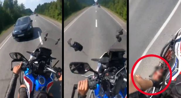 Las imágenes justamente muestran el momento en el que el atrevido conductor del pequeño vehículo a dos ruedas, decide rebasar en una carretera de dos vías a un tráiler, sin pensar las consecuencias de su acción. Justo cuando parece hacer logrado su cometido, otro auto tipo sedán en sentido contrario se atraviesa en su camino, golpeándolo y lanzando su bota al aire.