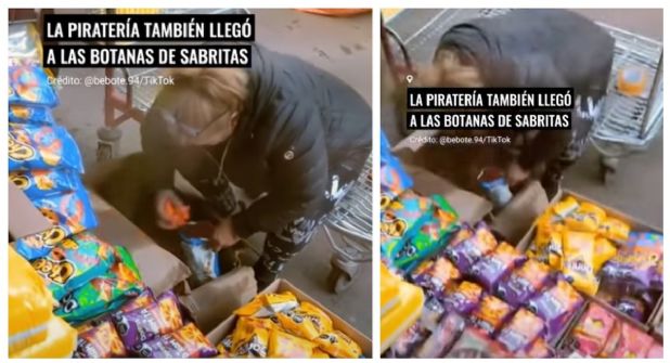 En un video que circula en redes sociales se ve a la mujer poniendo frituras en el interior de las clásicas bolsas de Sabritas, pero de una caja con producto a granel.