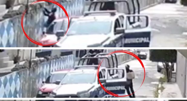 Uno de los policías se bajó de la unidad, incluso se ve cómo uno de sus compañeros que iba sobre la caja de la camioneta se sorprende al verlo descender y lo sigue con la mirada.