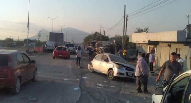 Un terrible accidente ocurrió esta mañana sobre el Camino a las Pedreras, en Escobedo, Nuevo León, luego de que el chofer de un camión de volteo provocara un choque múltiple con cinco vehículos; lamentablemente el hombre murió prensado y dejó a cinco personas heridas.
