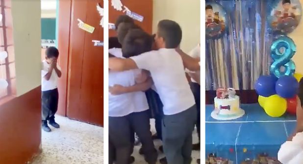 Un niño lloró de alegría por una fiesta sorpresa que le organizaron sus compañeros de la escuela cuando le organizaron el festejo sin que él sospechara.