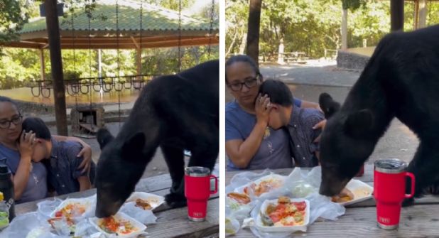 En las imágenes se observa cómo el oso comienza a devorar los tacos y enchiladas que estaban sobre la mesa mientras la mujer abraza a un niño, impidiéndole ver para que no se asustara, y otra jovencita, quien estaba del otro lado de la mesa.