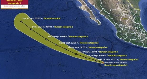 Jova, surgió el martes como tormenta tropical y este miércoles creció a huracán, se encontraba a 835 kilómetros al suroeste de Playa Perula, Jalisco, y a 970 kilómetros de Cabo San Lucas, Baja California Sur, en el último aviso del SMN.