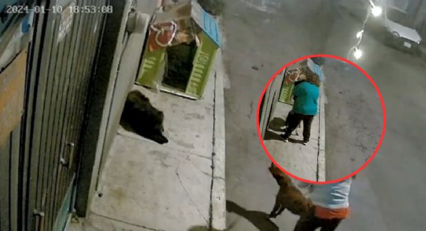 Ambas féminas se detienen frente a un perro de color oscuro que yace dormido en la banqueta y sin molestar a ningún paseante de la zona; una de estas mujeres golpea al can, mientras que la otra trata de hacer que el can que ellas llevan consigo para que este agrediera al pobre animal indefenso.