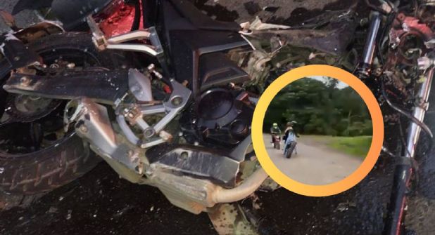 En el video, se puede ver a una pareja en una motocicleta ejecutando una maniobra arriesgada, mientras que una moto con un solo conductor se aproxima desde la dirección opuesta.