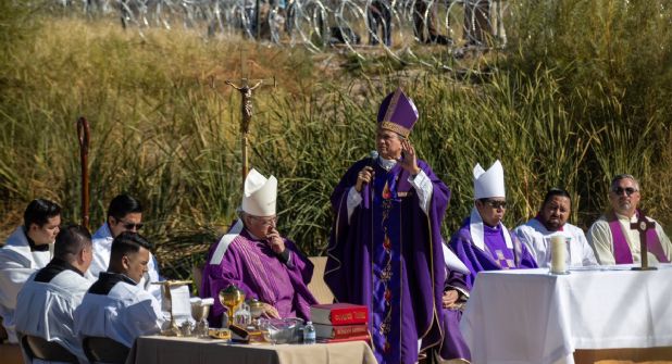 La celebración eucarística se llevó a cabo en el límite de la frontera entre Juárez, El Paso y Las Cruces, a la altura de la Casa de Adobe en esta localidad.
