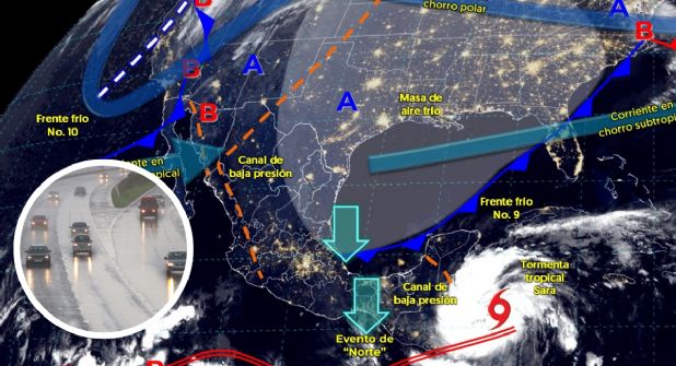 Durante este viernes la tormenta tropical Sara se localizará frente a las costas de Centroamérica mantendrá lluvias fuertes a muy fuertes en la península de Yucatán, así como en el sureste del país.