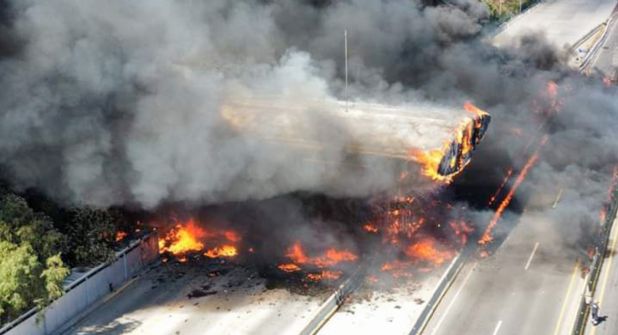 El choque, que involucró varios vehículos, desató una intensa movilización de los cuerpos de emergencia, quienes trabajan en el sitio para controlar las llamas y garantizar la seguridad en la zona.