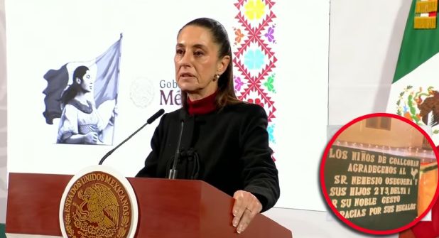 Sheinbaum condenó el contenido de la manta, así como el supuesto reconocimiento explícito a Nemesio Oseguera Cervantes, alias "El Mencho", líder del CJNG, durante la entrega de juguetes.