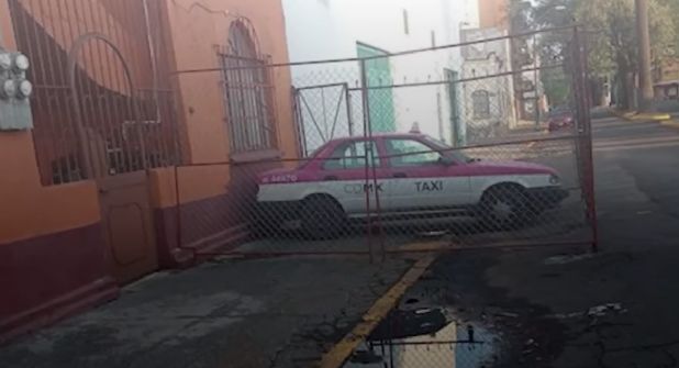 En un video que circula en redes sociales se puede ver un auto adaptado para taxi, estacionado en una banqueta con la parte trasera pegada a la propiedad y la delantera en la calle, impidiendo por completo el paso de peatones.