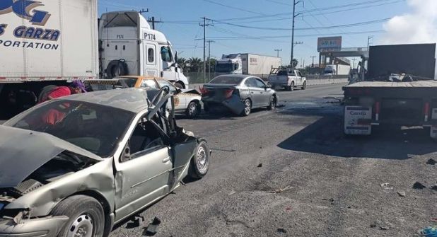 Entre los autosse encuentra un camión de transporte de personal y una camioneta, los autos con más daños fueron un taxi Nissan Tsuru, un Sentra y un Stratus, en el que viajaba la víctima, una mujer de la tercera edad.