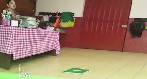 El vídeo, que rápidamente se volvió viral en plataformas como TikTok, muestra a la maestra en su escritorio, rodeada de una pila de cuadernos, aparentemente calificando las tareas de sus alumnos, quienes permanecen en silencio en sus asientos.