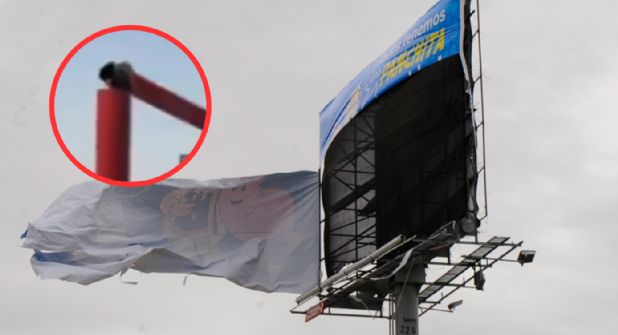 En el video se puede observar como el gran anuncio en color rojo del establecimiento es vencido de poco por las ráfagas de viento hasta partirlo por la mitad, venciendo la unión de este mismo, punto que cedió, haciendo que este cayera.