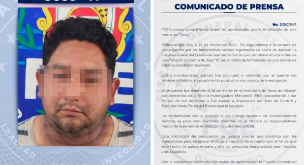 "El imputado fue detenido el 28 de marzo en el municipio de Taxco de Alarcón por elementos de la Policía Investigadora Ministerial (PIM), procediendo a dar lectura de sus derechos, y fue puesto a disposición del Juez de Control y Enjuiciamiento Penal del Estado que lo requiere", dice el comunicado de la Fiscalía de Guerrero.