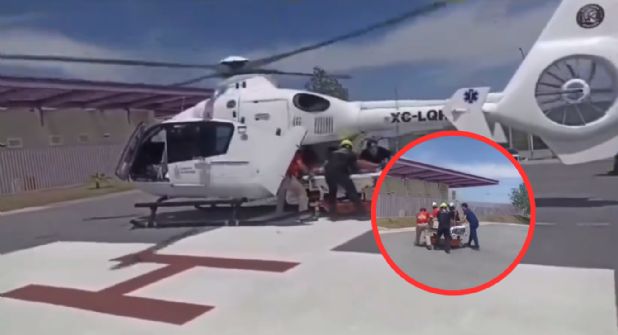En el video se puede observar como elementos de auxilio descienden del helicóptero con el joven en la camilla y rápido se movilizan para atenderlo.