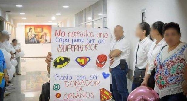 "No necesitas una capa para ser un superhéroe, basta con ser donador de órganos", decía uno de los carteles colocados en el pasillo.