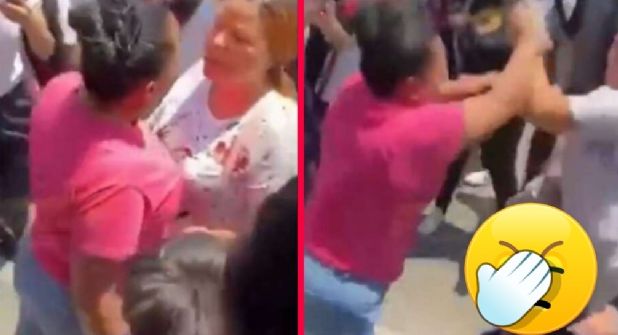 Las dos mujeres se encuentran paradas una frente a la otra y al parecer discutiendo agresivamente, cuando de pronto se acaba la paciencia de la de blusa rosa, quien comienza a darle golpes en el rostro a la otra.