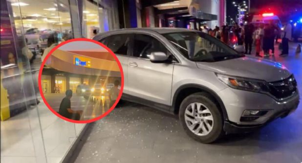 Identificado como José “N”, quien conducía una camioneta Honda CRV, retrocede varios metros tumbando los postes de contención e impactándose contra una tienda Coppel, proceso en el que casi atropella a una joven.