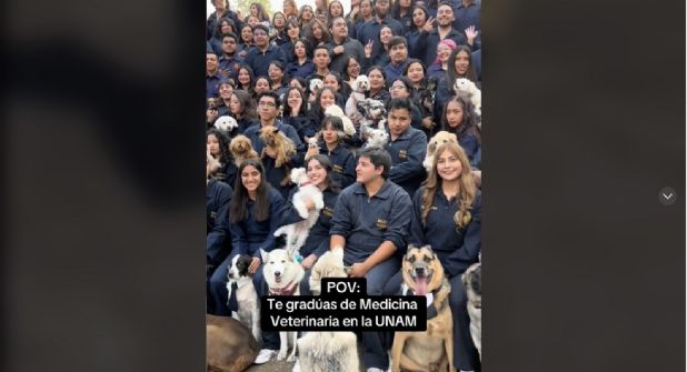Una fotografía de generación que se ha viralizado en redes sociales fue tomada en el campus Ciudad Universitaria de la Universidad Nacional Autónoma de México (UNAM) y llamó la atención de los internautas porque los recién egresados de la Facultad de Medicina Veterinaria y Zootecnia (FMVZ) fueron acompañados por sus perritos en este momento tan importante.