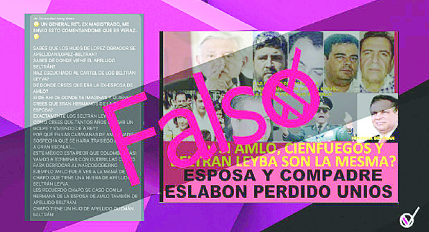 2.- Los Beltrán y AMLO.- Falso que primera esposa de AMLO sea familiar de los Beltrán Leyva, comprobó el medio Verificado.mx. En WhatsApp se divulgó un mensaje de un supuesto exmilitar y magistrado, en el que infiere que el origen del apellido de los hijos del Presidente de México, (López Beltrán) proviene de lazos familiares con un grupo del crimen organizado, pero lo dicho en el texto compartido es falso, detalla el medio.